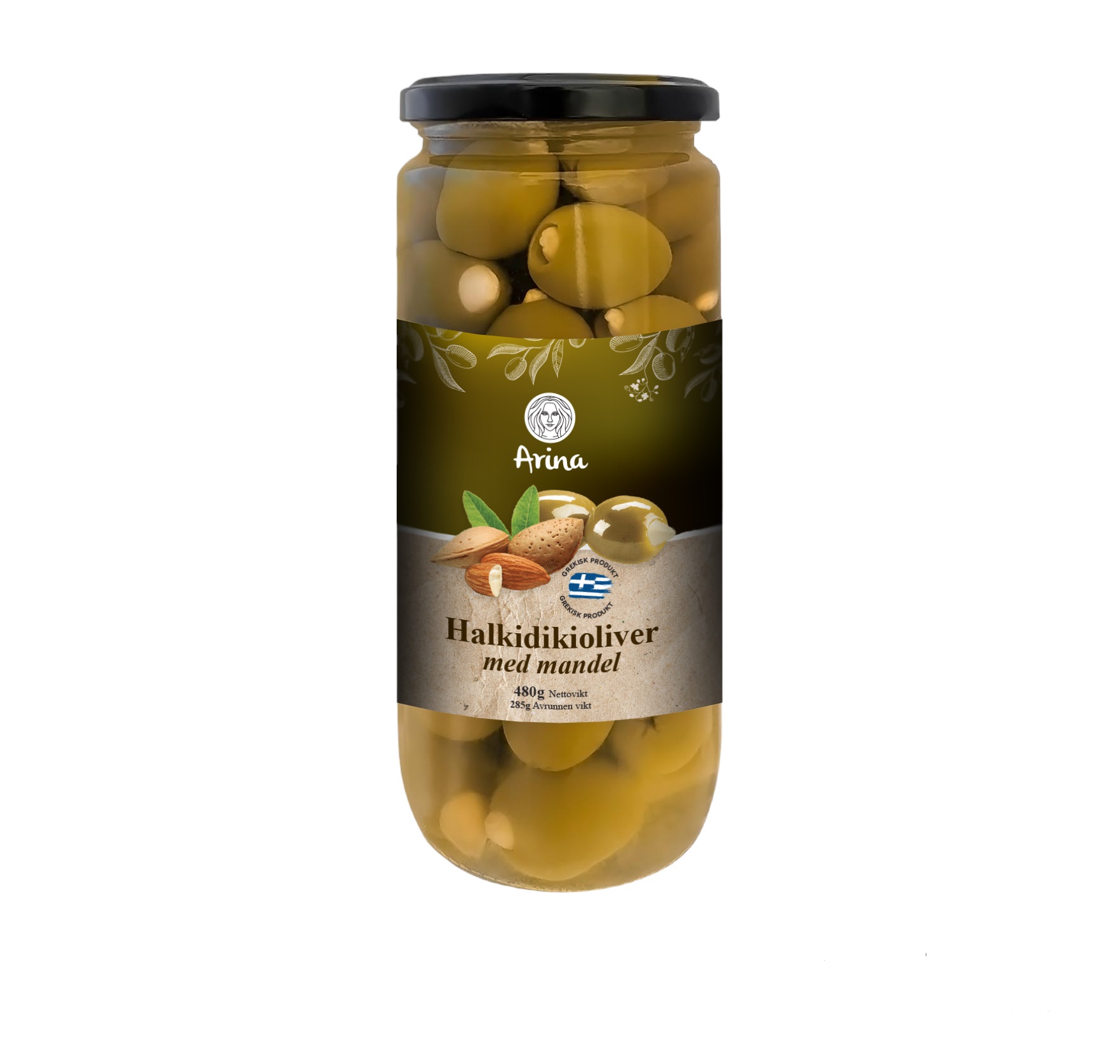 Ingredienser: Halkidikioliver 48%, mandel 9,5%, vatten, havssalt, konserveringsmedel: mjölksyra, surhetsreglerande medel: citronsyra. Grekisk produkt. Ska förvaras mörkt och svalt. Förvaras i kylskåp efter öppnande och konsumeras inom 3 veckor. Pastöriserad produkt. Kan innehålla spår av kärnor. För allergener, se ingredienser i fet stil.