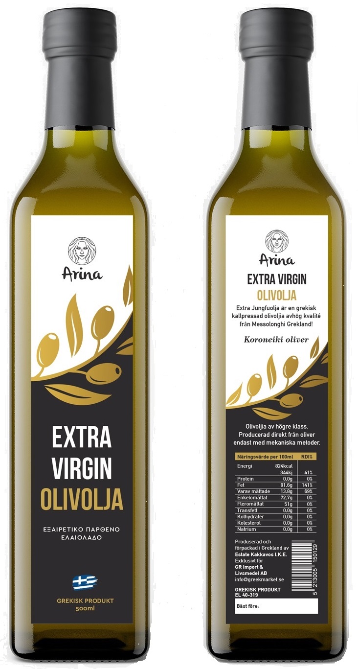 Extra Jungfruolja Arina, är en grekisk kallpressad olivolja (endast mekaniska metoder) av hög kvalité från Messolonghi i Grekland.